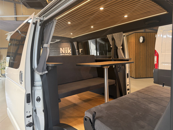 セカンドシートの対面ソファ。リヤ席を対面へ展開すると4人が座れるダイニングの出来上がり。向かい合う座席は、楽しく語り合ったり、食事をしたり、時には打合せにも使えるコミニケーション空間です。
