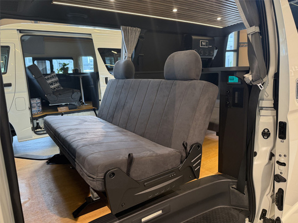 ベッド/大人2名が寝れます。2列目シートをフラットに展開。後部マットと並べて簡単にベッドができます。クッション性が高いマットは肌触りの良いスエード生地を使用。リラックスして身体を休む事ができます。